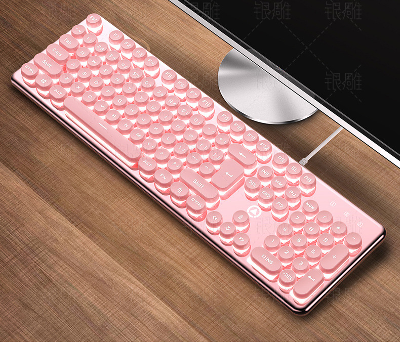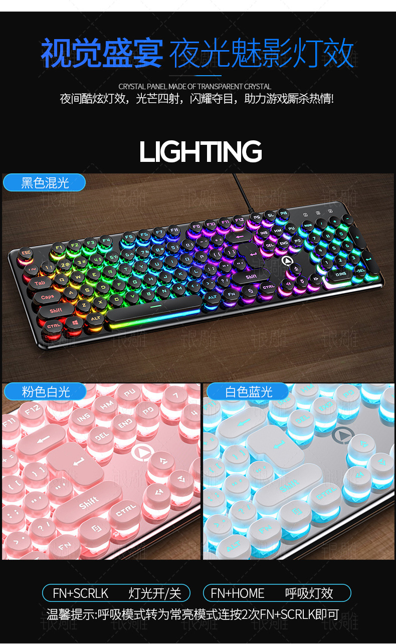 银雕V7水晶机械手感游戏有线键盘圆形朋克键帽发光